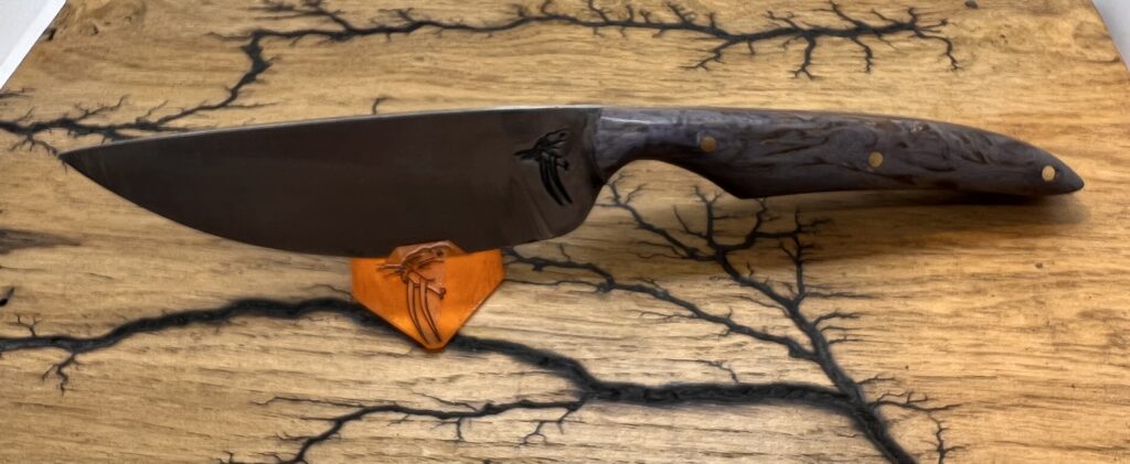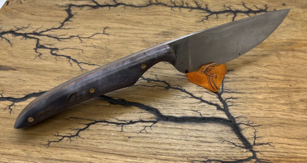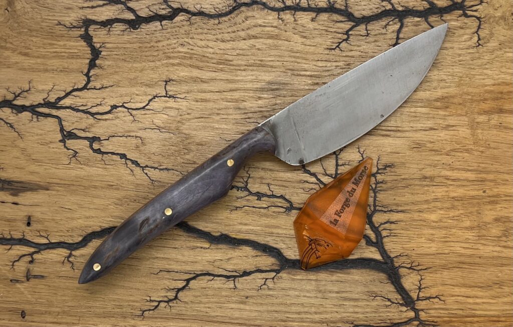 Son manche est en bouleau de carélie stabilisé et teinté violet.