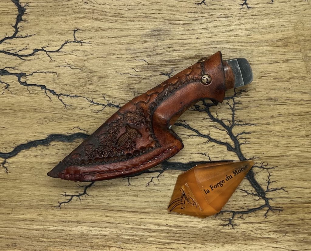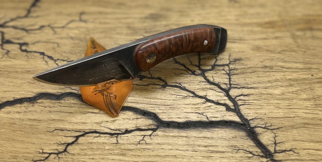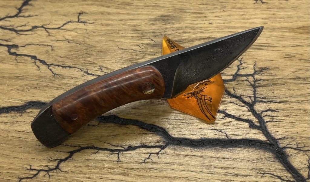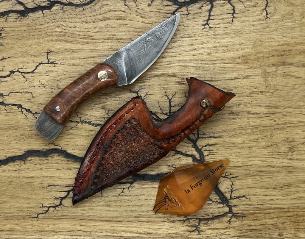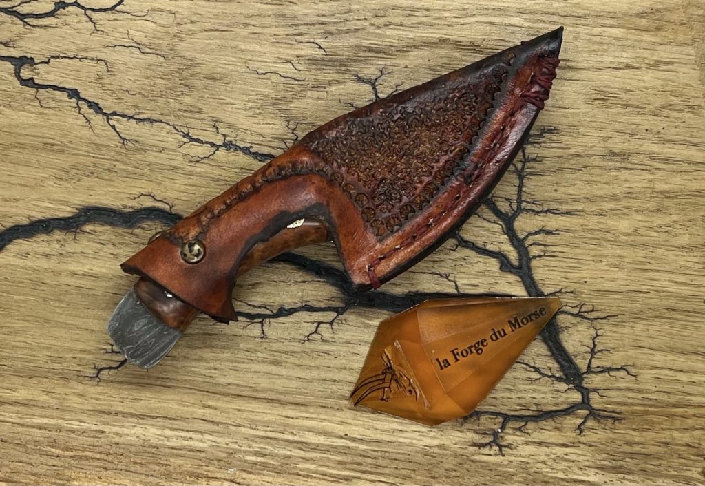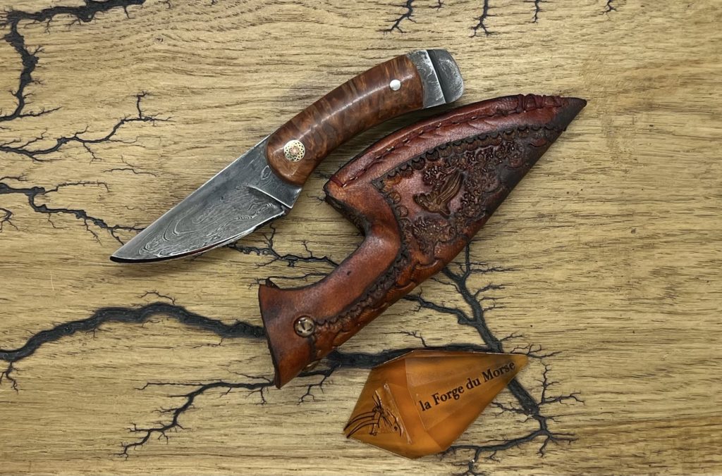 Son manche est en loupe d’Amboine stabilisé. Ses intercalaires sont en fibres vulcanisées rouge brique.