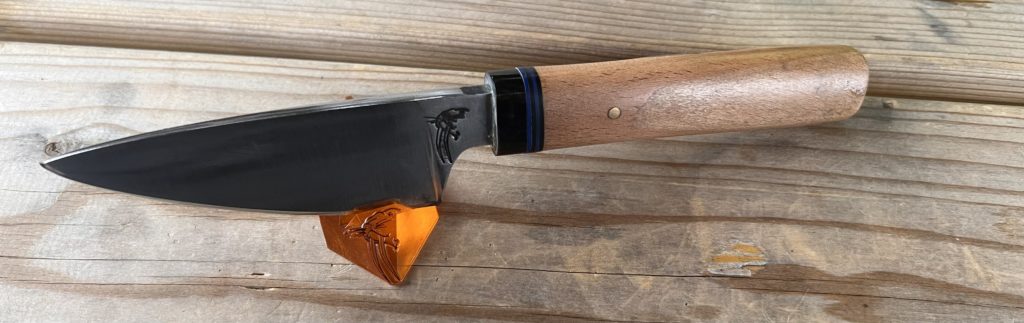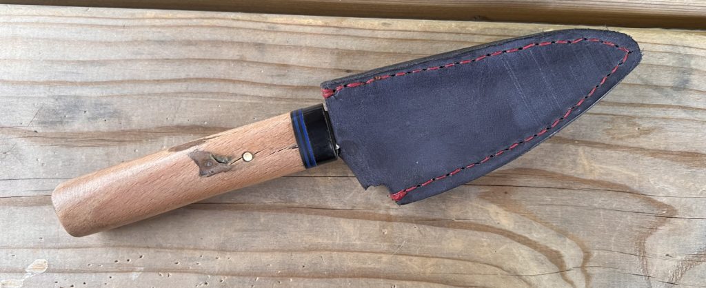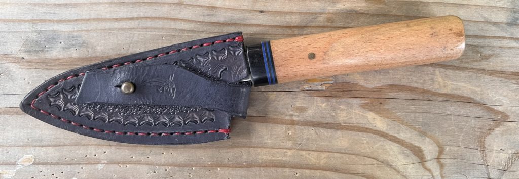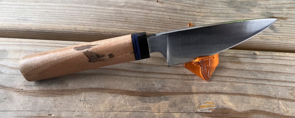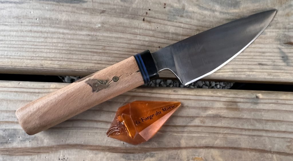 Il a un morceau de corne de buffle et des intercalaires en fibre vulcanisée noire et bleue.