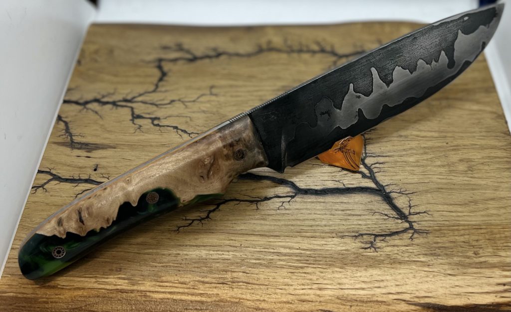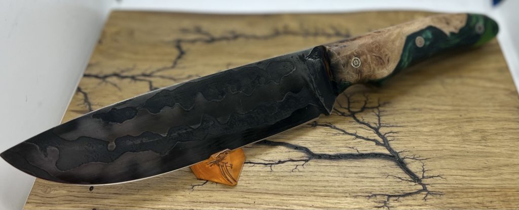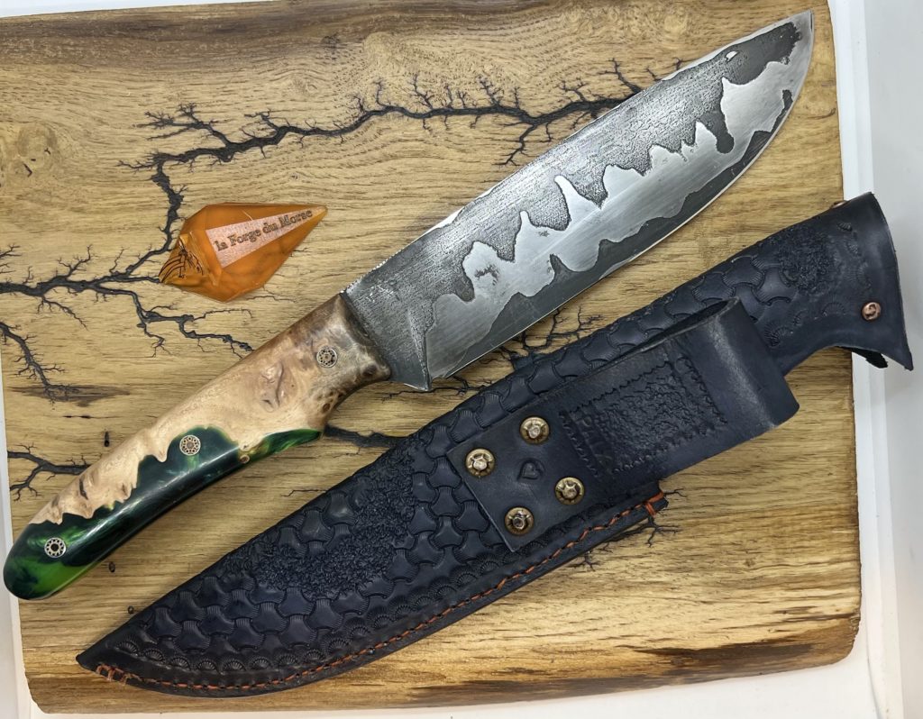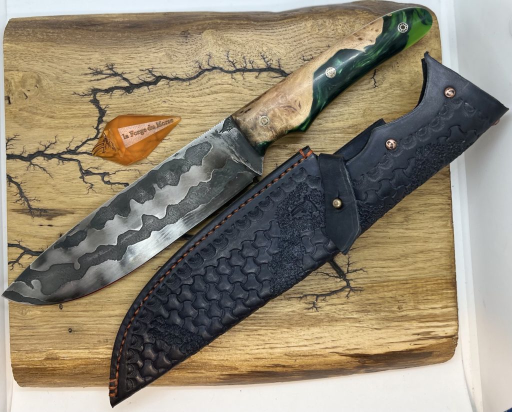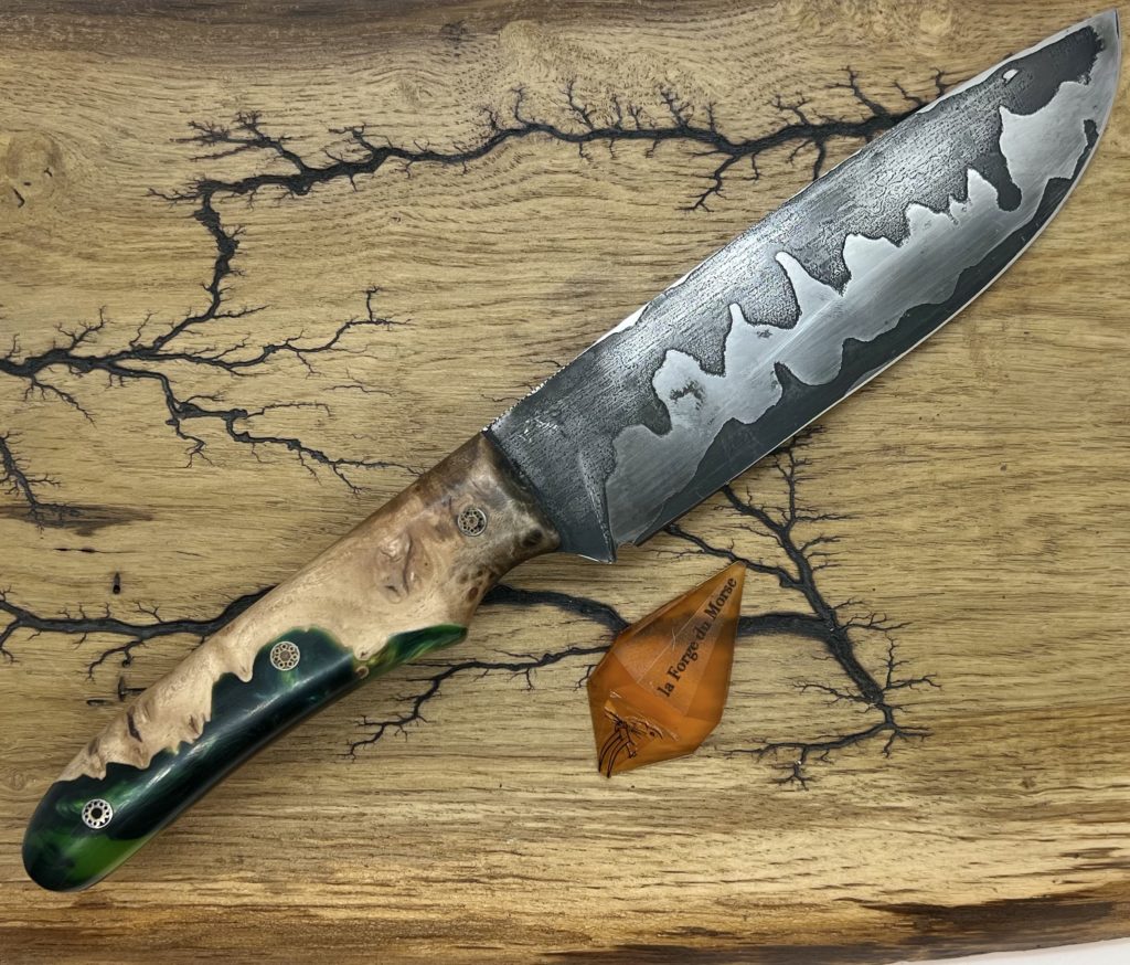 Ce couteau est un couteau en acier Damas de 5 couches. Cet acier est composé d’acier O2 et de 75NI8.