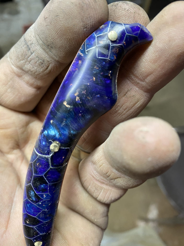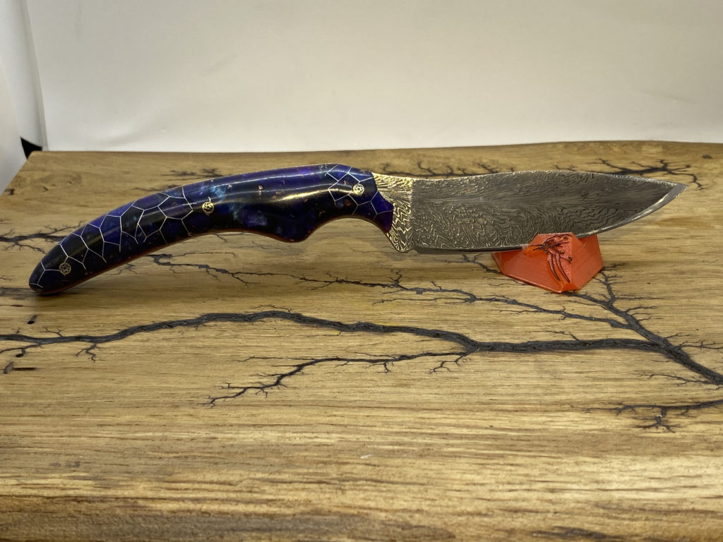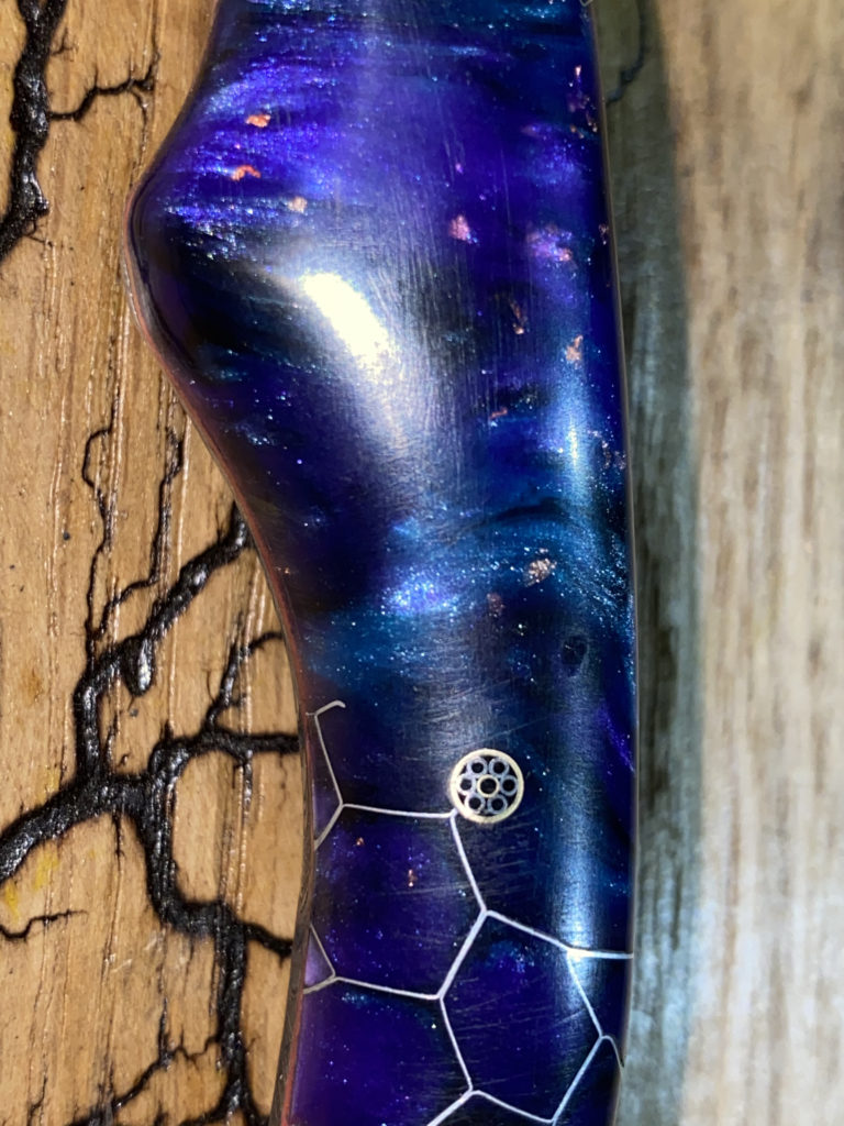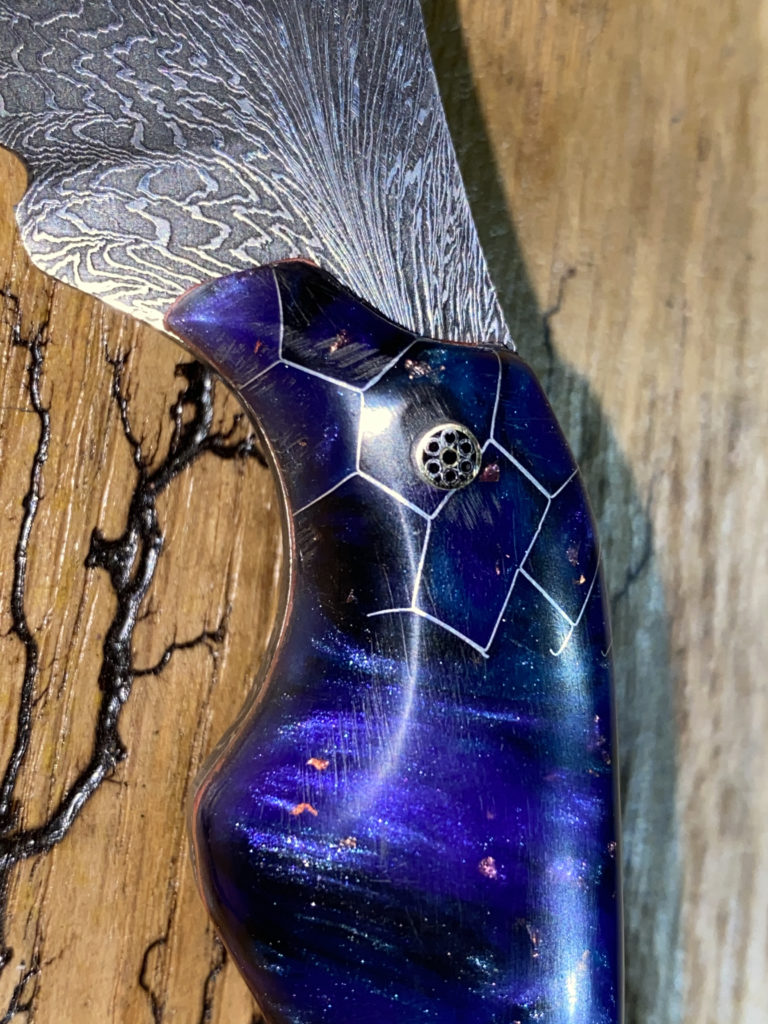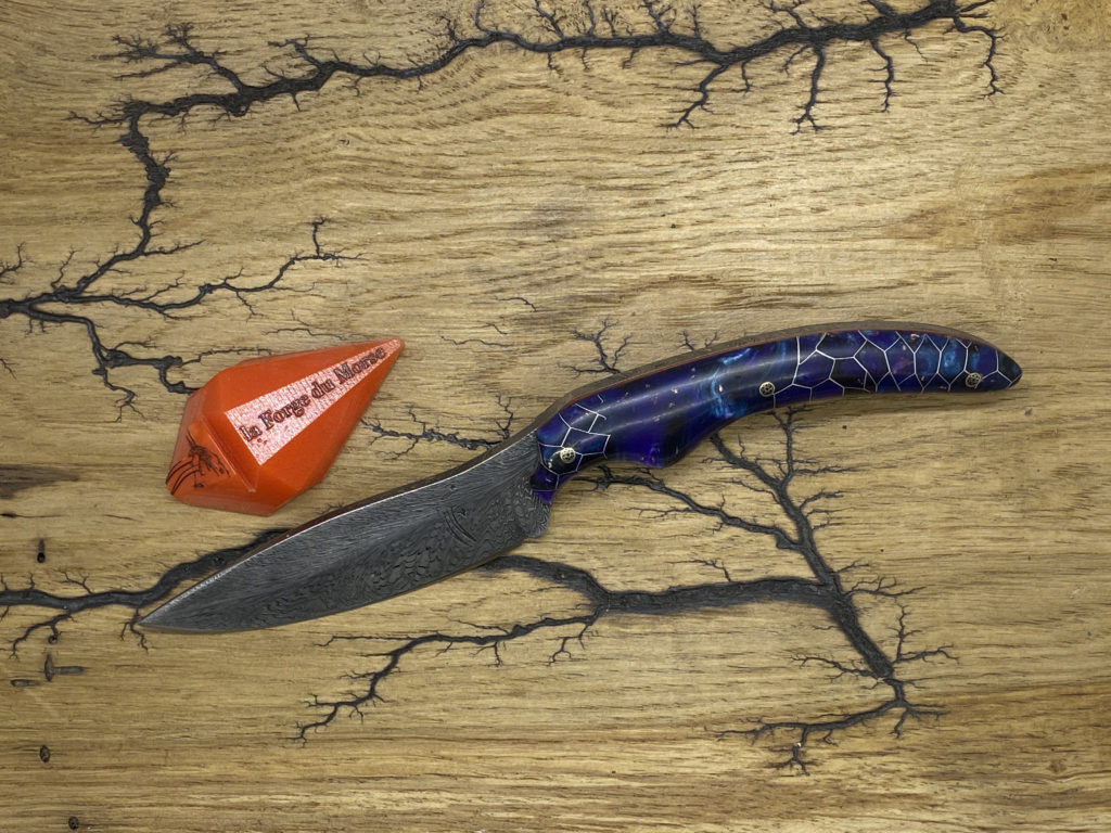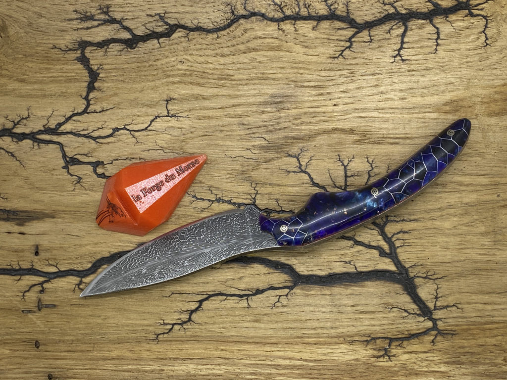 Le manche est en résine Cosmos crée par la Coutellerie du Rat Noir