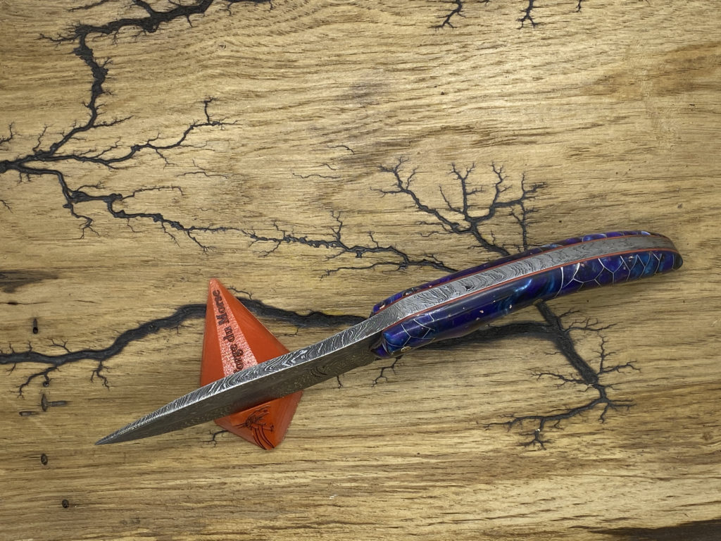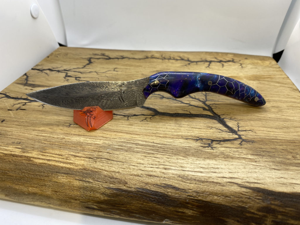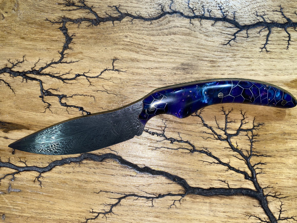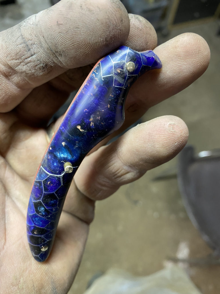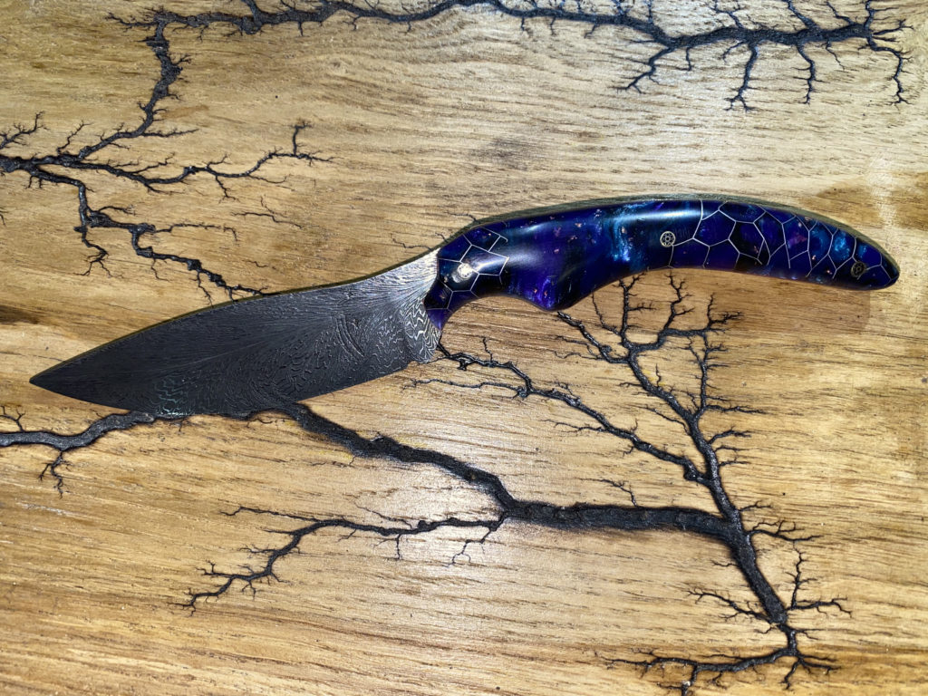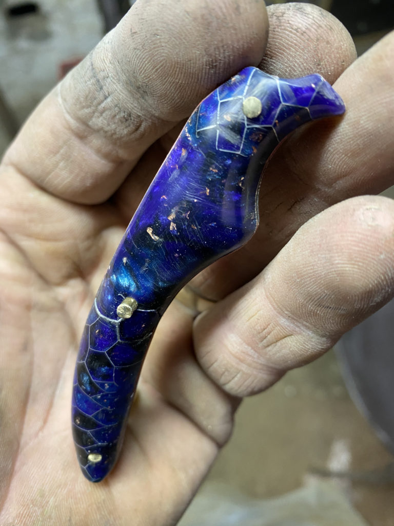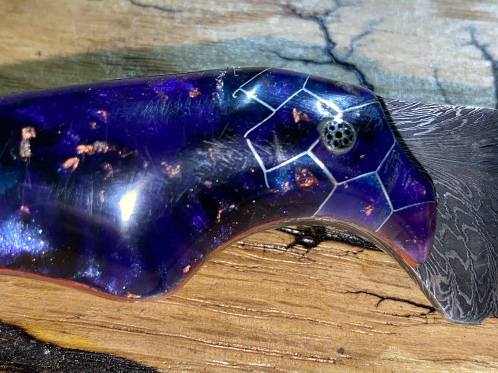 Le manche est en résine Cosmos crée par la Coutellerie du Rat Noir